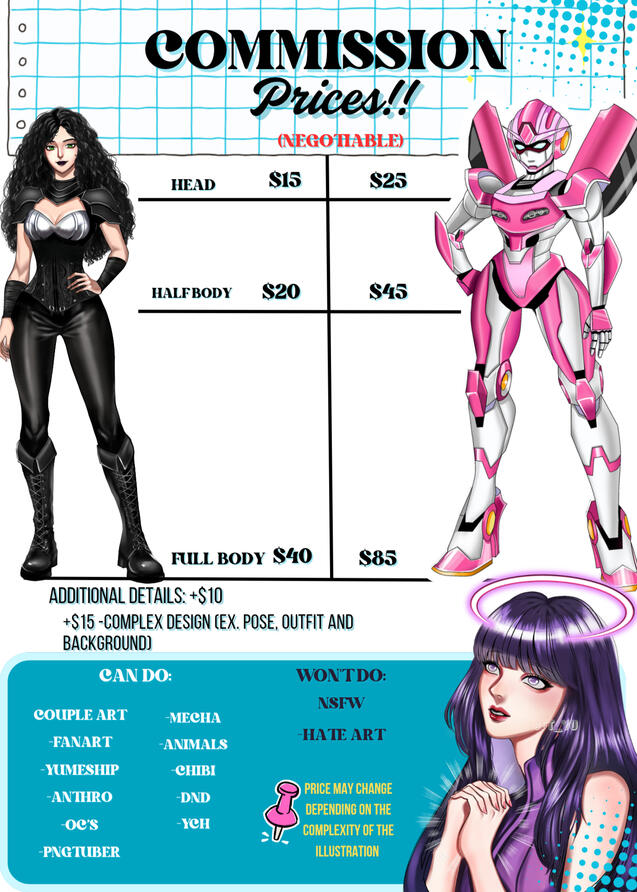 -unlimited revisions during the sketch phase of the commission however when I am finished with flat colors and you want revisions depending on it may charge you extra $10.